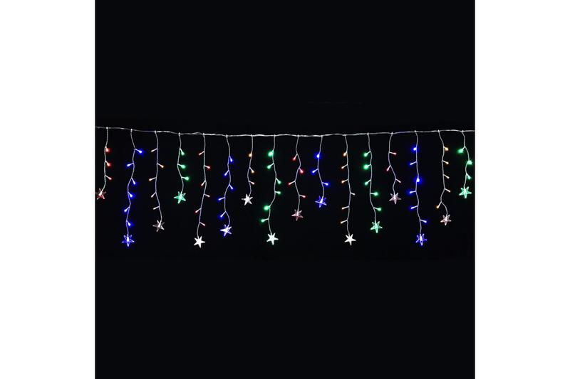 Гирлянда-бахрома с яркими разноцветыми светодиодами - оригинальная конструкция, представляющая собой 18 свисающих нитей с прозрачными насадками-звездочками на концах. Данная декорация обеспечивает оформление вертикальных элементов интерьера, особенно удачно она смотрится на окнах и витринах.