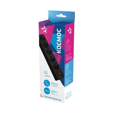 Удлинитель с сетевым фильтром 5х5м с заземл. 10А IP20 2.2кВт ПВС 3х0.75 с выкл. с индикатором сети черн. КОСМОС FKsm5m-5g(B)