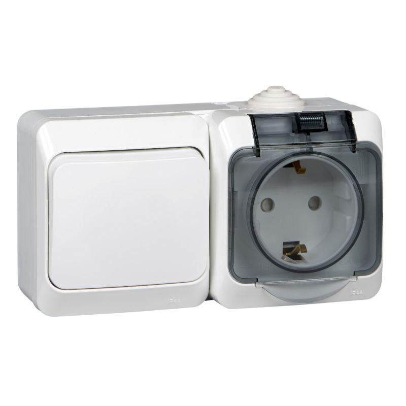 Блок ОП Этюд (розетка 16А 250В евростандарт с заземл. защ. шторки + 1-кл. выкл.) IP44 бел. SE BPA16-241B