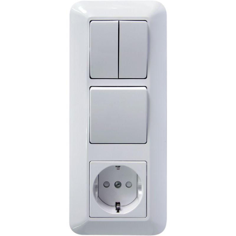 Блок комбинированный Schneider Electric ПРИМА (скрытой установки, белый) предназначен для сетей до 250 В, состоит из розетки на 16 А со шторками и с заземлением, одноклавишного выключателя и двухклавишного выключателя, оба на 6 А.