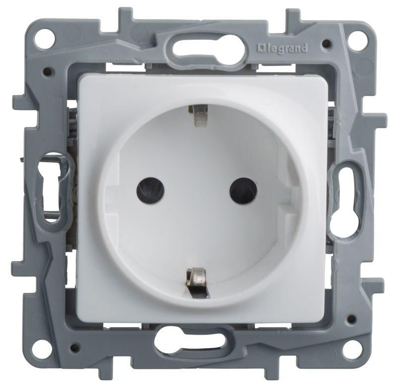 Представляет собой одноместный модуль розетки, со стороной 71 мм, с защитным контактом стандарта SCHUKO. Изготовлен из пластика, белого цвета, со шторками. Монтируется под штукатурку.