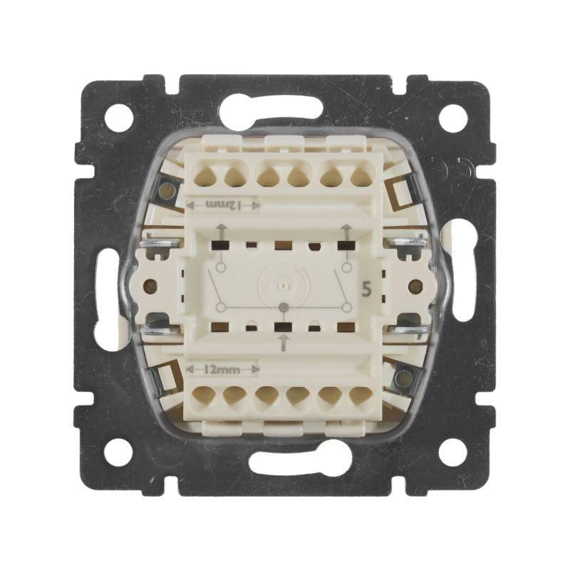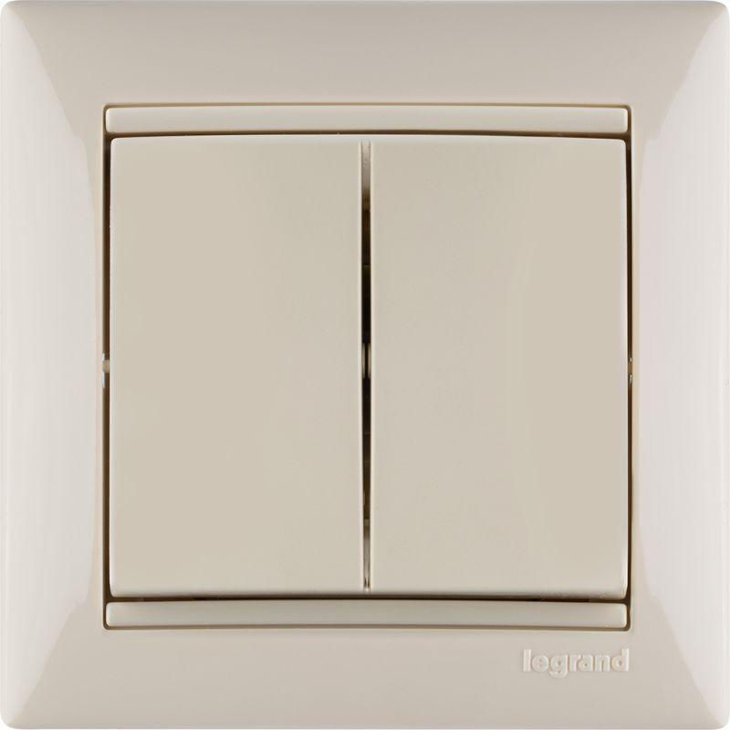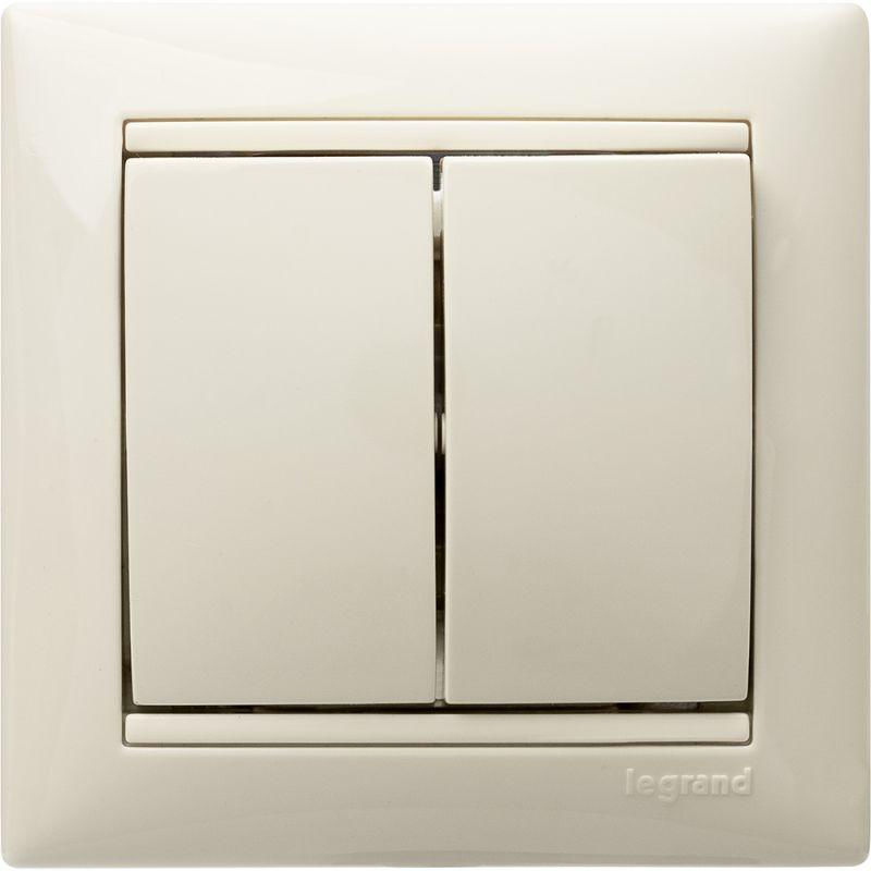 Представляет собой механизм выключателя с двумя клавишами. Цвета слоновой кости. Изготовлен из пластика. Монтируется под штукатурку.