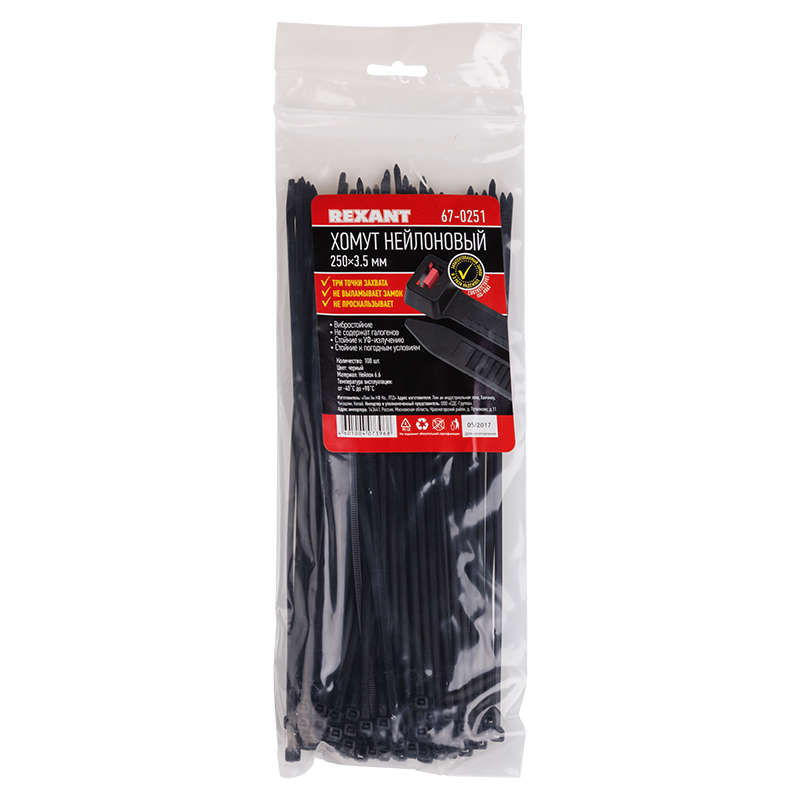 Хомут кабельный 3.6х250 тройной замок нейл. черн. (уп.100шт) Rexant 67-0251