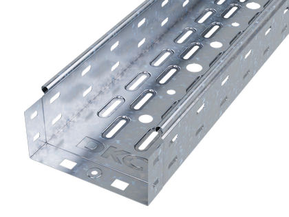 Перфорированные листовые лотки ДКС применяются для прокладки кабеля как в помещении, так и на открытом воздухе. Лотки отличаются высокой несущей способностью – подформовка, производимая при производстве этой продукции, создает дополнительное ребро жесткости, что увеличивает несущую способность системы до 54%. Перфорация сокращает вес конструкции. В лотках имеются отверстия для отвода кабеля диаметром 11 мм, 17 мм, 21 мм. Степень пыле- и влагозащиты перфорированных лотков – IP 10 при использовании крышек, входящих в состав системы. Метод соединения "мама-папа" применяемый для системы, существенно сокращает время монтажа и создает непрерывный контур. Конструктив листовых лотков ДКС предупреждает повреждение кабеля при прокладке. Толщина стали – 0,7 мм, высота лотка – 80 мм, ширина – 100 мм, длина – 3000 мм. Полезное сечение – 7800 мм. Исполнение – "сталь, оцинкованная по методу Сендзимира".