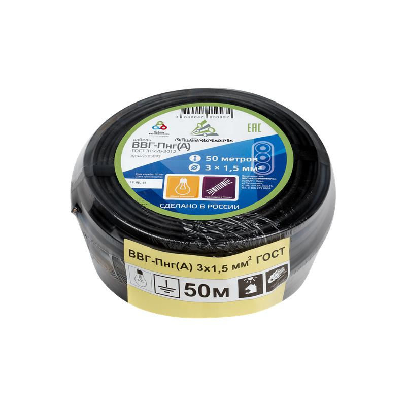 Кабель ВВГ-Пнг(А) 3х1.5 ок (N PE) 0.66кВ (бухта 50м) (шт) АЛЬФАКАБЕЛЬ 465528