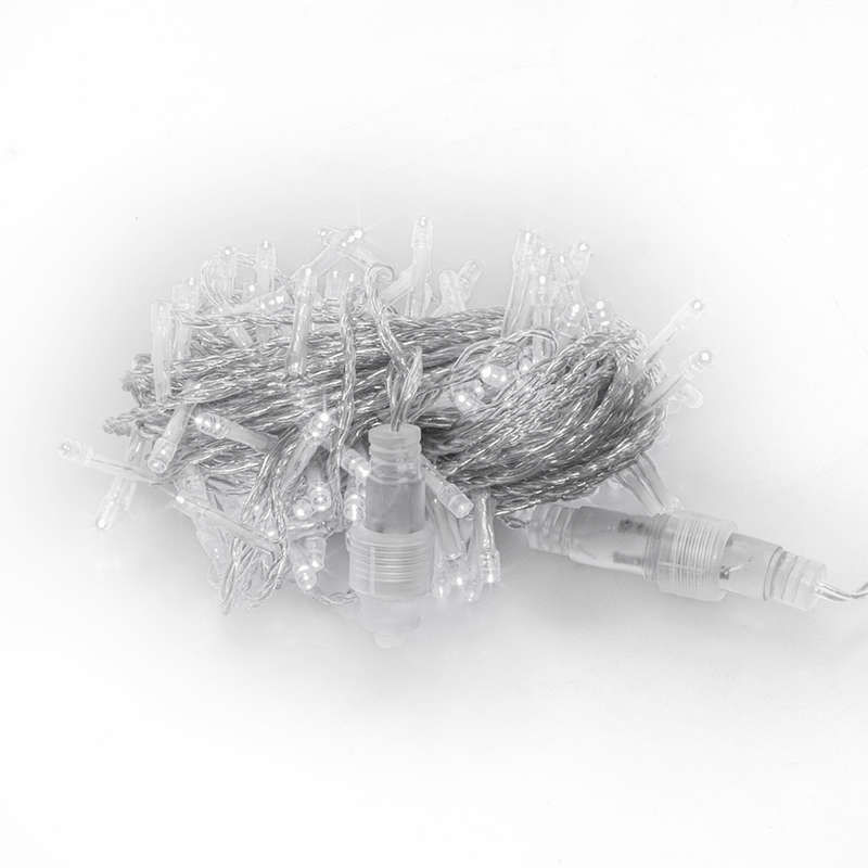 Назначение - для использования внутри и вне помещения (IP44); Длина - 12 метров; Тип ламп - Светодиоды (цвет белый); Расстояние между лампами - 10 см, диаметр лампы - 5 мм; Кол-во ламп - 120;