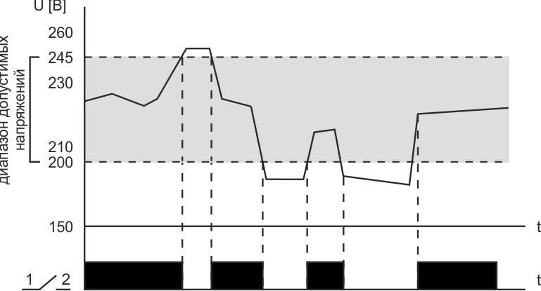 Контакт реле замкнут и нагрузка включена, если контролируемое напряжение находится в установленном диапазоне. Диапазон (верхнее и нижнее значения) устанавливается посредством кнопок на лицевой панели. Повторное включение реле (после отключения)