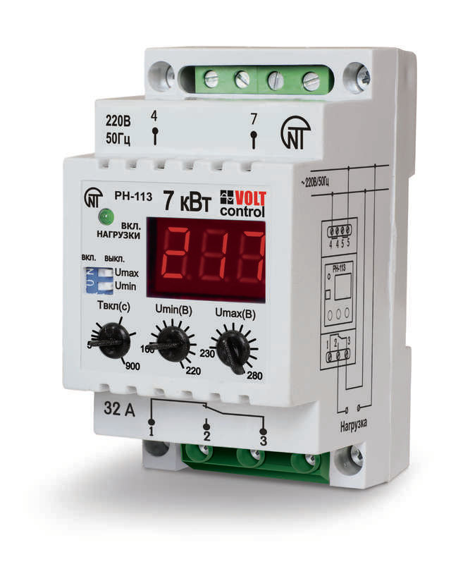 Реле напряжения РН-113 1-ф. предназначено для обеспечения безопасного отключения промышленной и бытовой однофазной нагрузки (220В и 50Гц) в случае недопустимых колебаний напряжения в сети. Кроме того, функциональность реле предполагает автоматическое включение, как только параметры сети восстановятся.