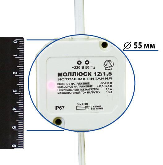 12 В, 1,5 А. Расширенный сетевой диапазон — 90...250 В, габариты — 50х50х25 мм, скругленные края O 55 мм, защита выхода от КЗ и перегрузки, прочность изоляции 3 кВ, отверстия для крепления, корпус IP67. Обновление модели: Белый корпус, светодиодная индикация.