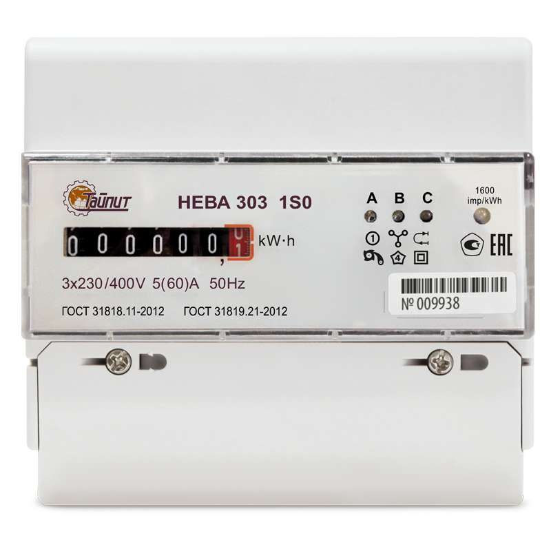 Счетчик НЕВА 303 1S0 3ф 5-60А 230/400В 1 класс точн. 1 тариф. мех DIN-рейка Тайпит 6056054
