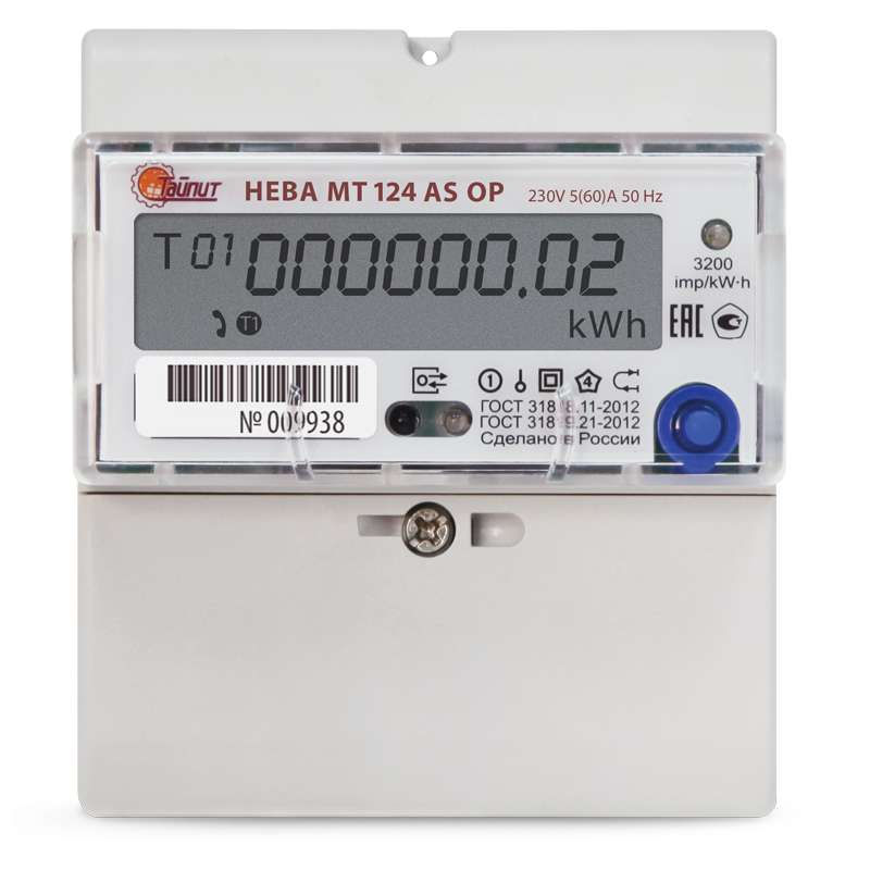 Счетчик НЕВА МТ 124 AS ОР 1ф 5-60А 220В многотариф. оптопорт; профиль мощности; журнал событий DIN ЖКИ Моск. вр. Тайпит 6105277