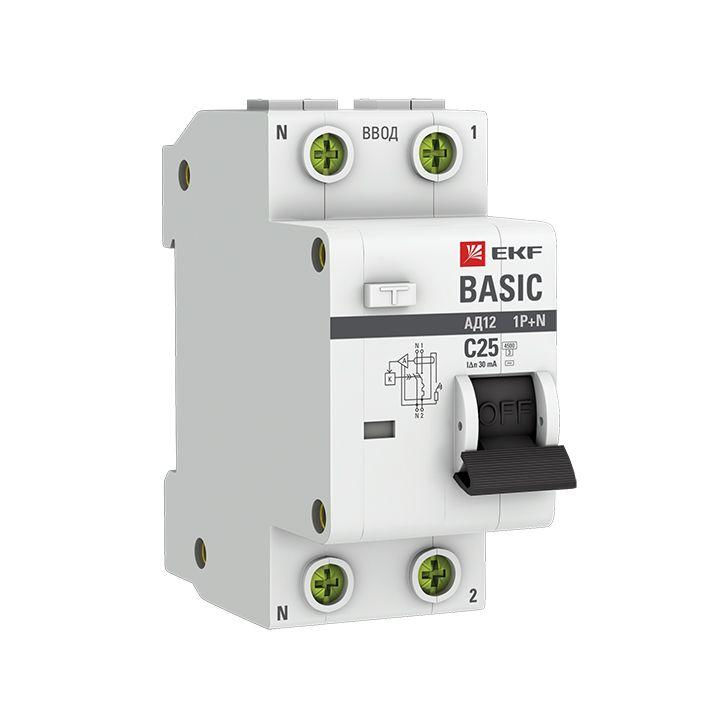 Выключатель автоматический дифференциального тока 2п (1P+N) C 25А 30мА тип AC 4.5кА АД-12 Basic EKF DA12-25-30-bas